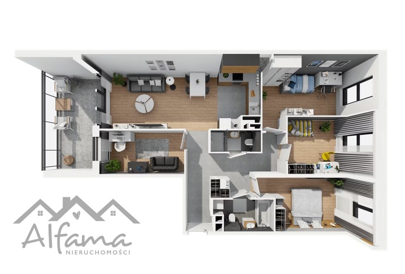 Mieszkanie składa się z przestronnego salonu z aneksem kuchennym,czterech sypialni, dużej łazienki,wc, ustawnego przedpokoju oraz