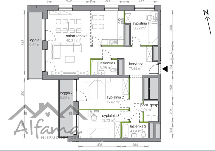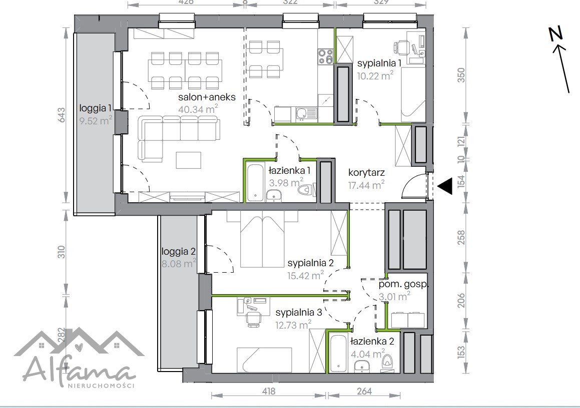 2 Balkony: 9.52 m² i 8.08 m²
