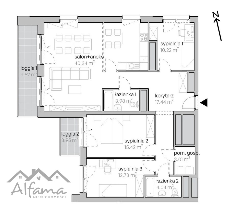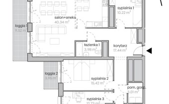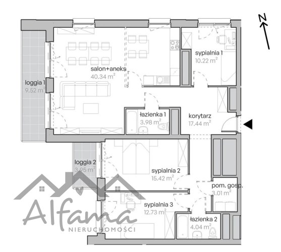 Największa z sypialni, z bezpośrednim wyjściem na loggię 2 (3,95 m²) — świetna na główną sypialnię lub pokój dziecięcy.