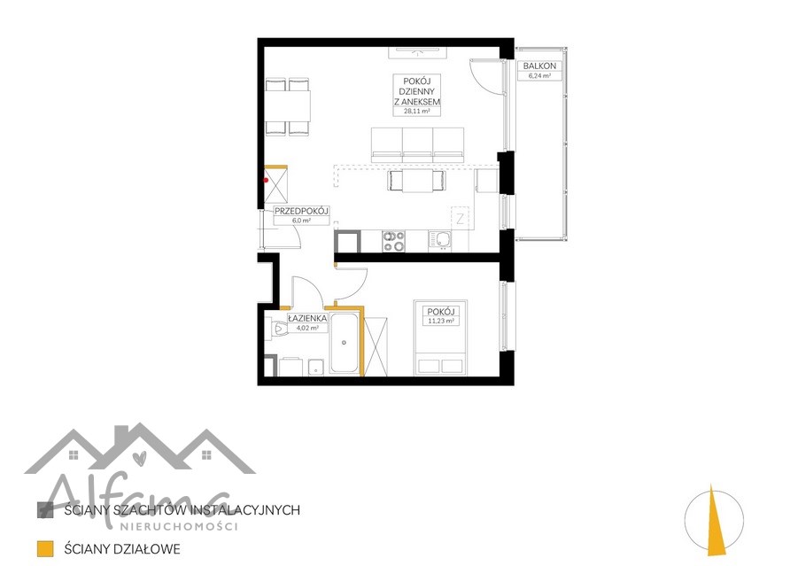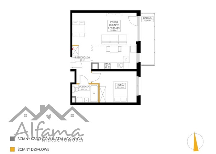 Mieszkanie składa się z przestronnego salonu z aneksem kuchennym-możliwość wydzielenia kuchni, sypialni, ustawnego przedpokoju, dużej łazienki, oraz dodatkowo dużego balkonu (6,20m2).