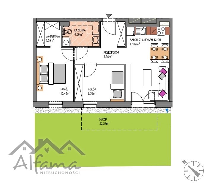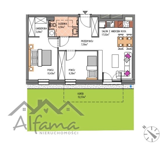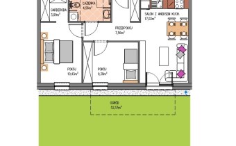salon z aneksem kuchennym, 2 sypialnie,łazienka z wc , holl,garderoba