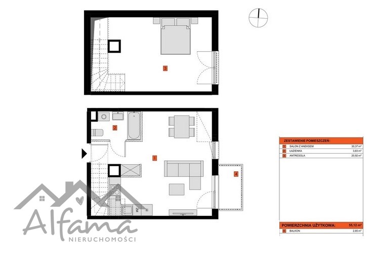 Mieszkanie składa się z przestronnego salonu z aneksem kuchennym(30m2-możliwość wydzielenia sypialni), ustawnego przedpokoju z miejscem na szafę, łazienki,antresoli(21m2) oraz  balkonu.