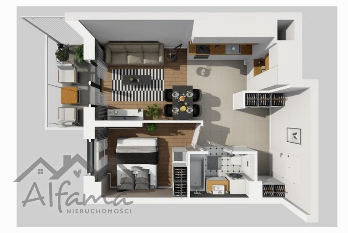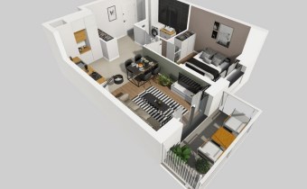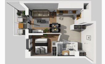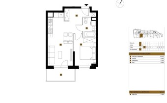Mieszkanie składa się z ustawnego pokoju dziennego z aneksem kuchennym, sypialni, przedpokoju z miejscem na szafę, łazienki, oraz dodatkowo balkonu o powierzchni ok.5m2.
