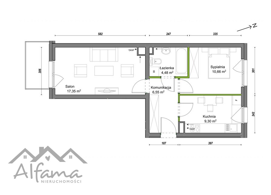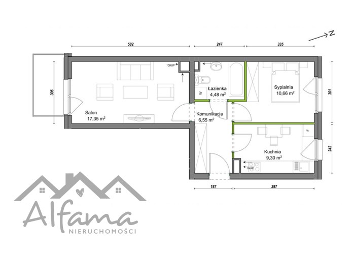 Słoneczne, dwustronne mieszkanie 2-pokojowe o powierzchni 48,30 m2 usytuowane na drugim(ostatnim) piętrze kameralnego budynku wielorodzinnego.