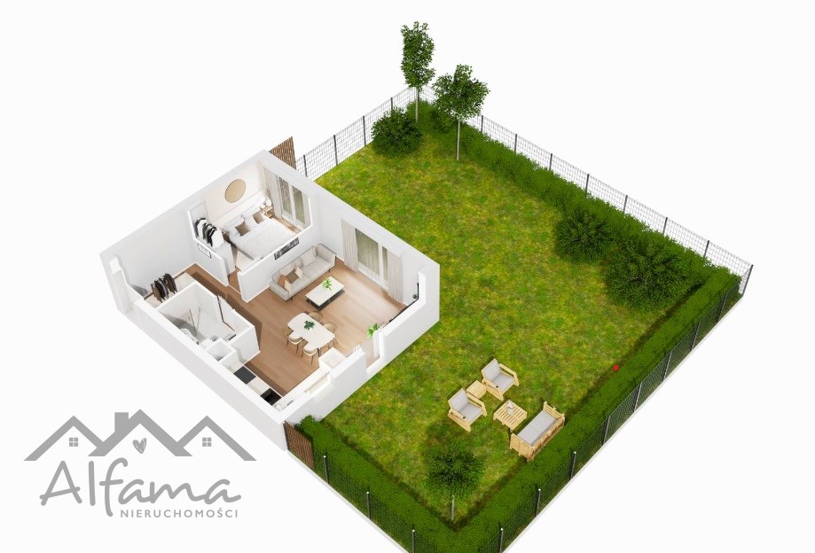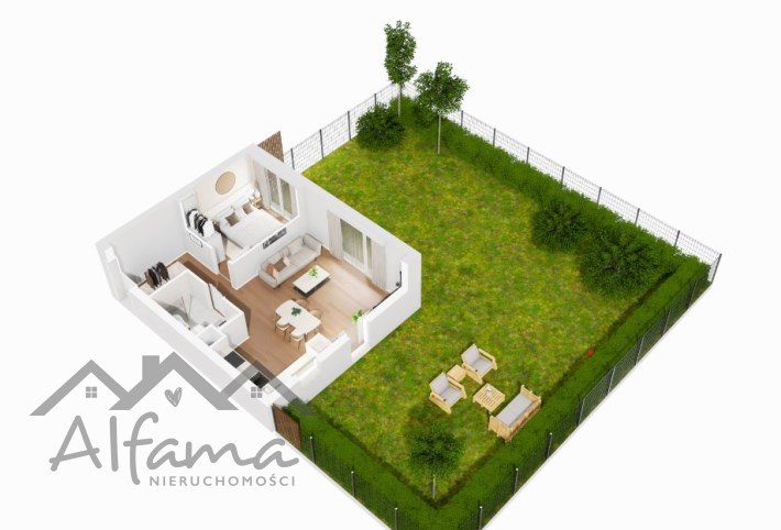 Mieszkanie składa się z przestronnego salonu z aneksem kuchennym(28m2), sypialni, ustawnego przedpokoju, łazienki, oraz dodatkowo ogródka o powierzchni162m2.
