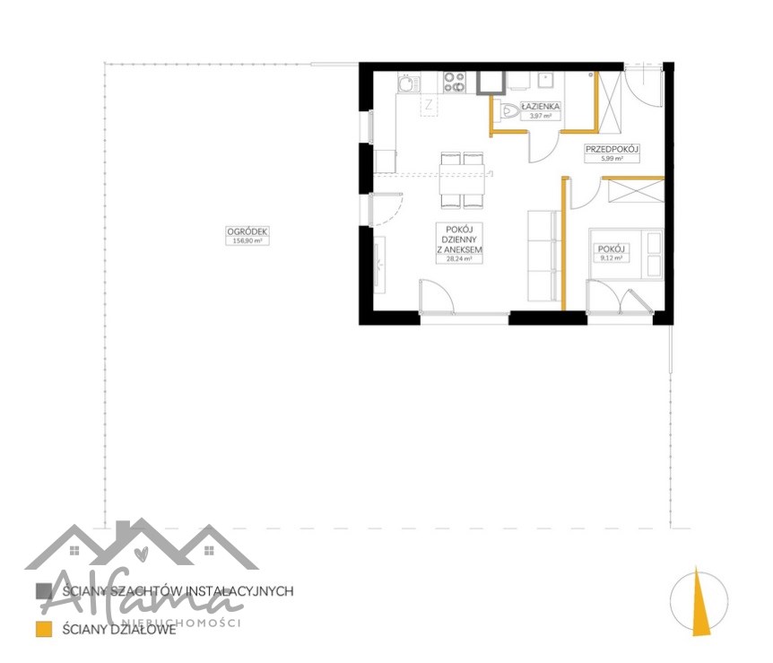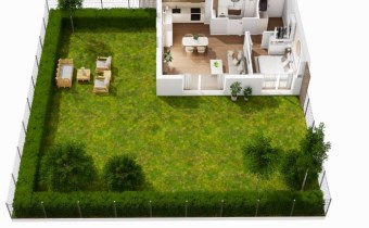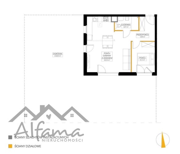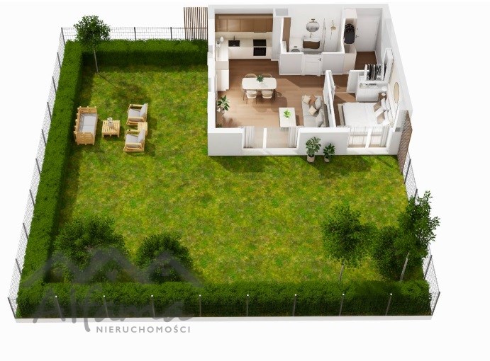 Mieszkanie składa się z przestronnego salonu z aneksem kuchennym(28m2)-możliwość wydzielenia kuchni, sypialni, ustawnego przedpokoju, łazienki, oraz dodatkowo ogródka o powierzchni ok.157m2!