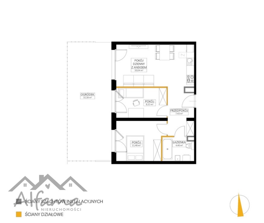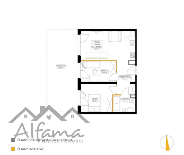 Mieszkanie składa się z przestronnego salonu z aneksem kuchennym, 2 sypialni, ustawnego przedpokoju, łazienki oraz dodatkowo ogródka o powierzchni 32m2.