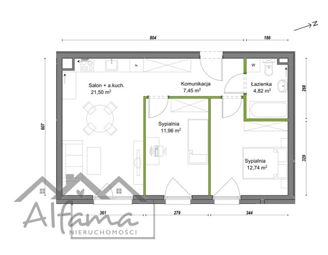 Ustawna, otwarta przestrzeń z miejscem na stół jadalniany oraz wygodną strefę wypoczynkową. Aneks kuchenny ulokowany wzdłuż jednej ściany zapewnia ergonomiczny układ i dużą powierzchnię roboczą. Wyjście na balkon dopełnia strefę dzienną.