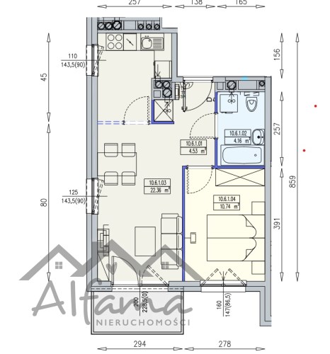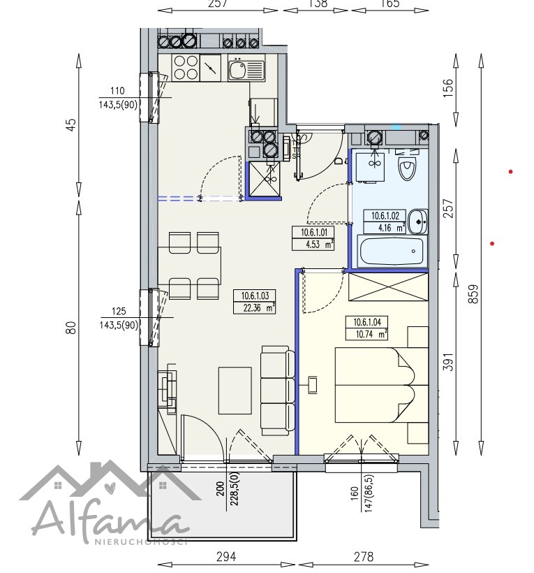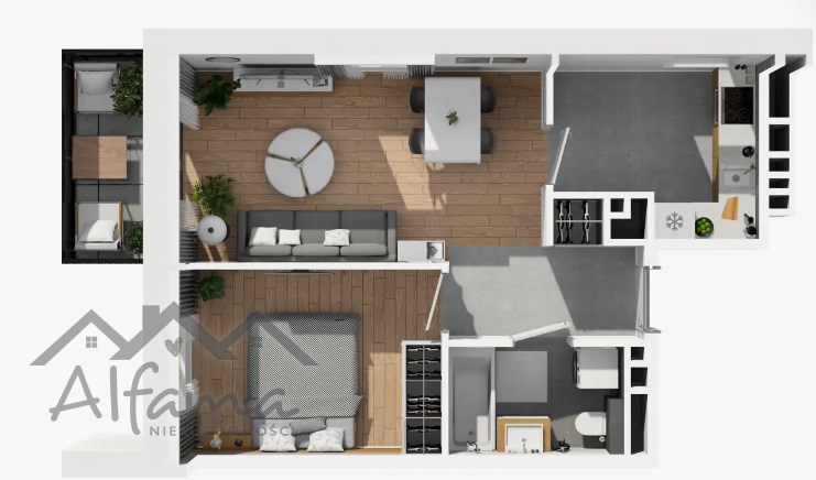 Mieszkanie składa się z przestronnego salonu z aneksem kuchennym-