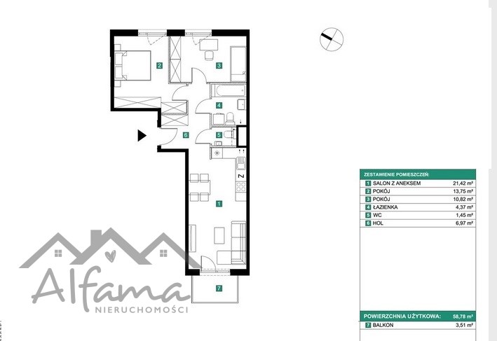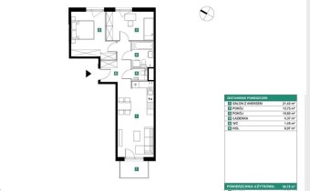 Słoneczne,narożne mieszkanie o powierzchni ok.58m2 usytuowana na pierwszym piętrze budynku wielorodzinnego-ten sam układ jest też dostępny na wyższych kondygnacjach.
