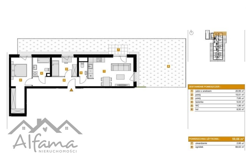 2 sypialni, funkcjonalnego przedpokoju/garderoby dużej łazienki,wc i dodatkowo narożnego ogródka(60m2).