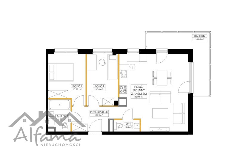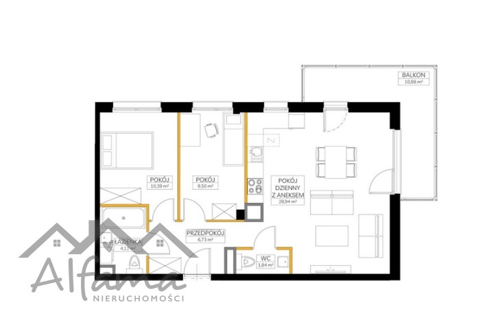 Mieszkanie składa się z przestronnego salonu z aneksem kuchennym, 2sypialni, ustawnego przedpokoju, łazienki,wc oraz dodatkowo narożnego balkonu o powierzchni ok.11m2