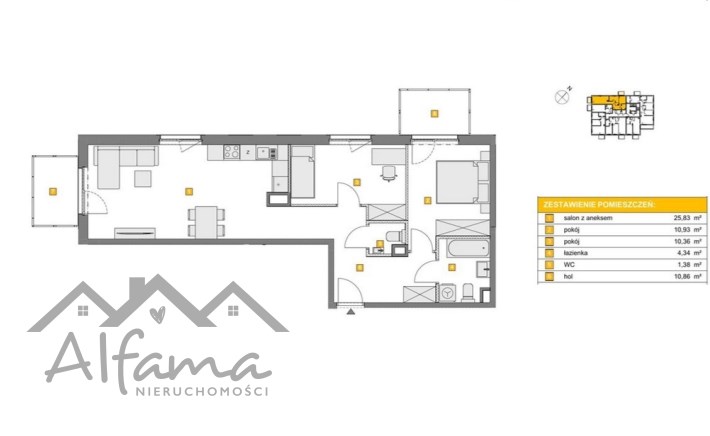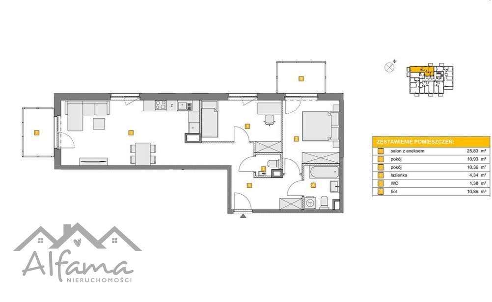 – salon z aneksem kuchennym: 25,83 m²