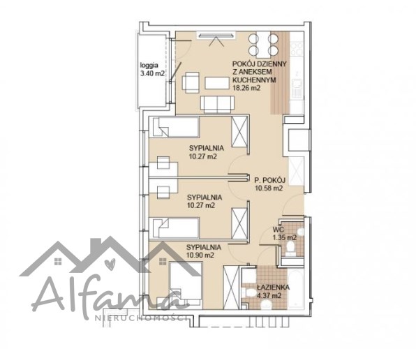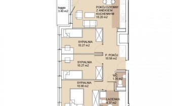 Mieszkanie składa się z przestronnego pokoju dziennego, 3 dużych sypialni, przedpokoju, łazienki, wc oraz dodatkowo loggi.