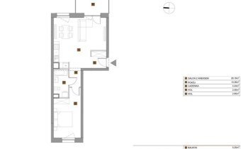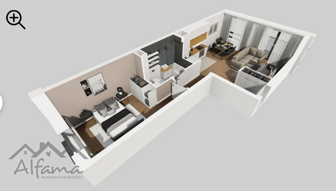 Mieszkanie składa się z przestronnego,ustawnego pokoju dziennego z aneksem kuchennym (26m2), sypialni, przedpokoju z miejscem na szafę, łazienki oraz
