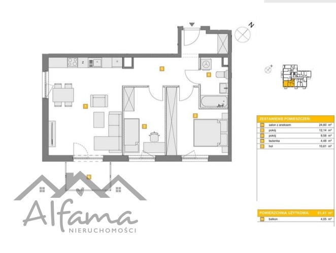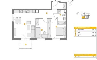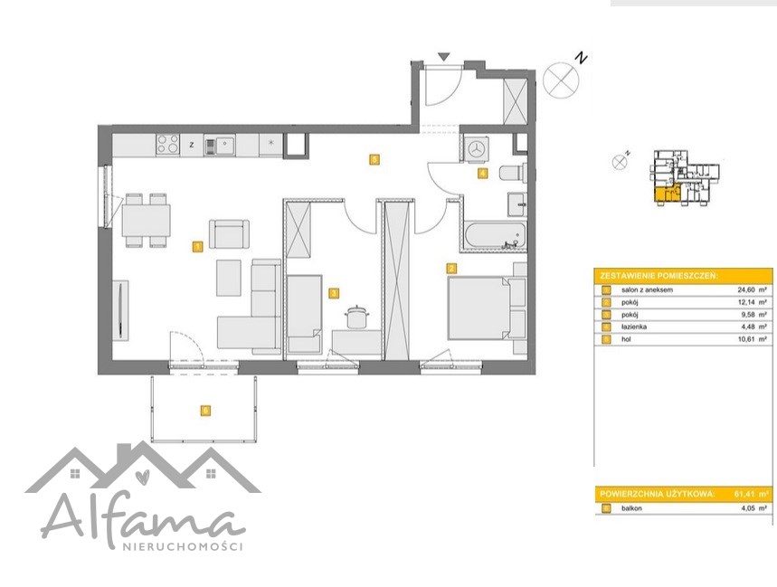 Oferujemy bardzo funkcjonalne, słoneczne mieszkanie 3-pokojowe o powierzchni 61,40 m², na 1.piętrze.