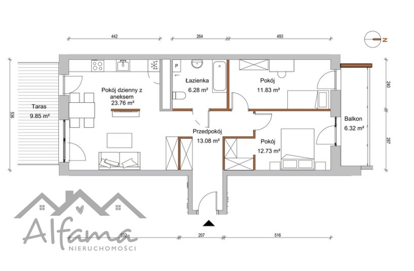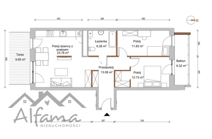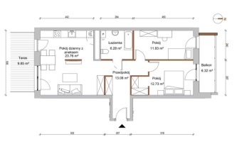 • pokój dzienny z aneksem kuchennym – 23,76 m² z wyjściem na taras (9,85 m²),