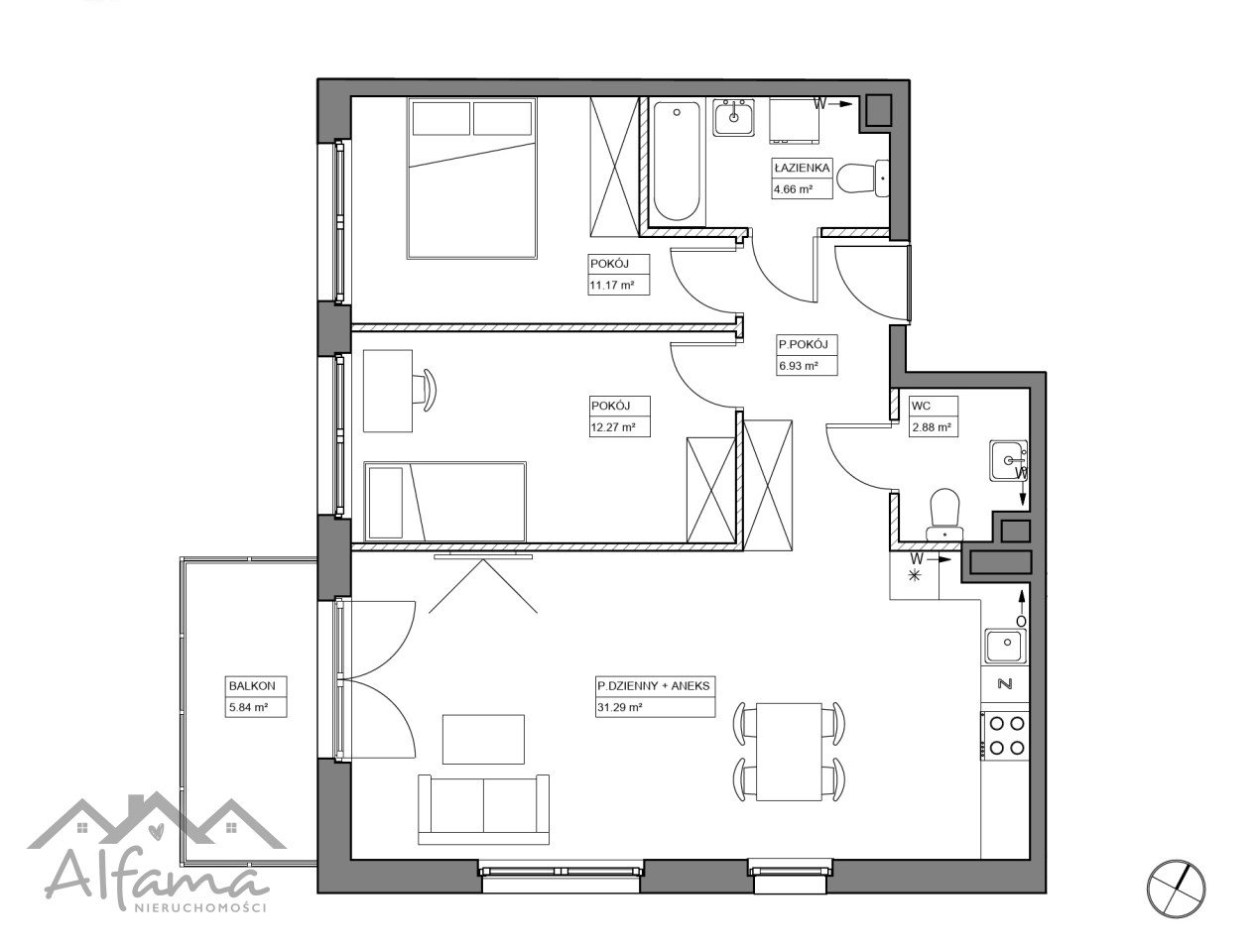 Mieszkanie składa się z przestronnego pokoju dziennego(ok.31m2) , dwóch ustawnych sypialni, przedpokoju z miejscem na szafę, łazienki,wc oraz