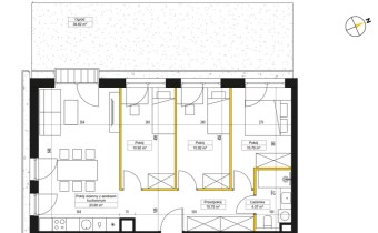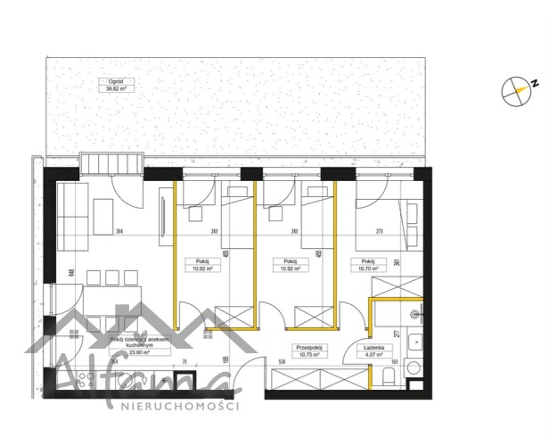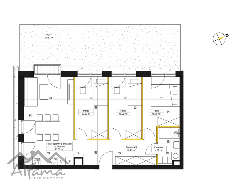 Mieszkanie składa się z przestronnego salonu z aneksem kuchennym , 3 sypialni, ustawnego przedpokoju, łazienki, oraz dodatkowo Ogródka(40m2)