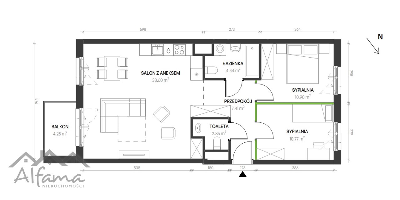 Salon z aneksem kuchennym 33,60 m² z wyjściem na balkon 4,25 m²