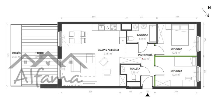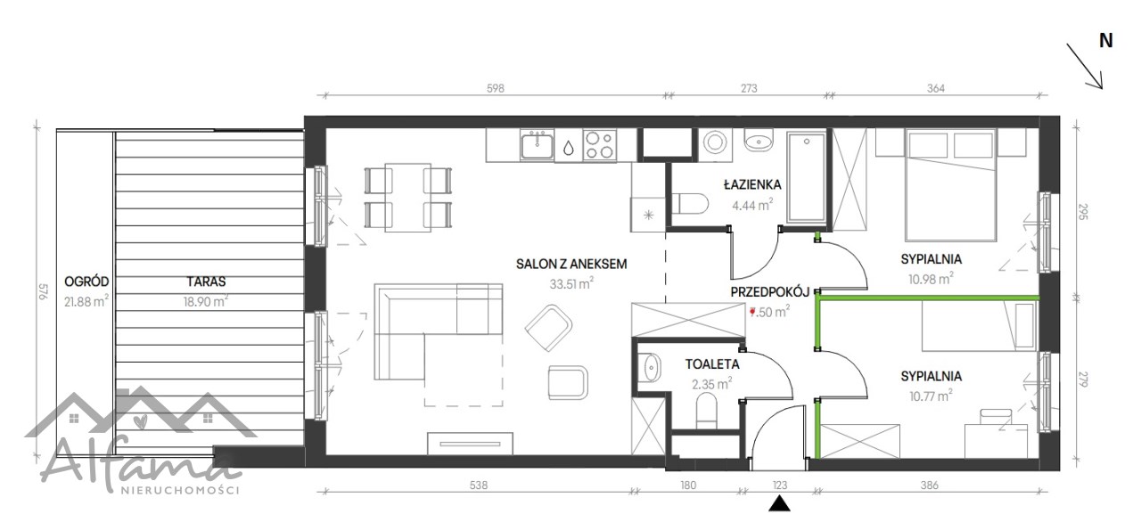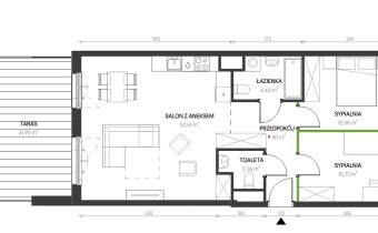 Salon z aneksem kuchennym 33,60 m² z wyjściem na taras z ogródkiem 40m2