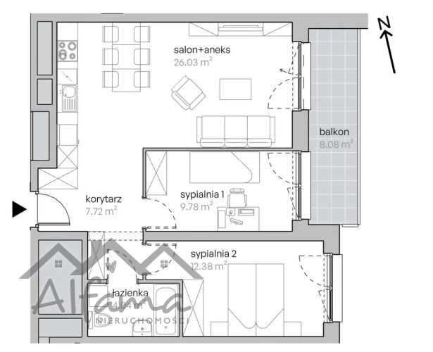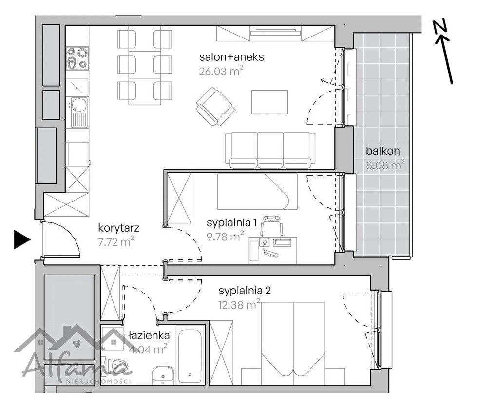 • przestronny salon z aneksem kuchennym 26,03 m²