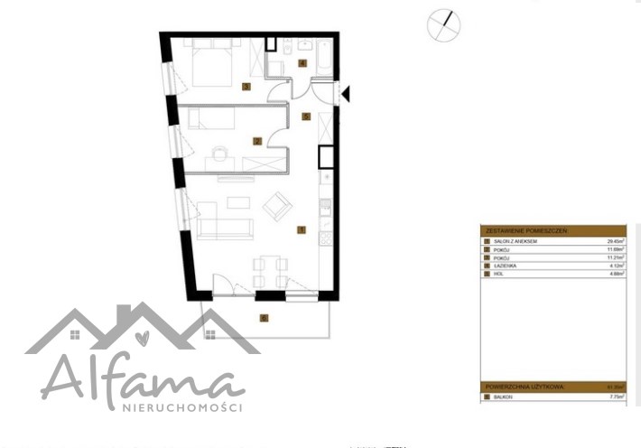 Mieszkanie składa się z  przestronnego pokoju dziennego z aneksem kuchennym(ok.30m2) ,dwóch ustawnych sypialni, przedpokoju z miejscem na szafę, łazienki  oraz dodatkowo balkonu o powierzchni ok.8m2.