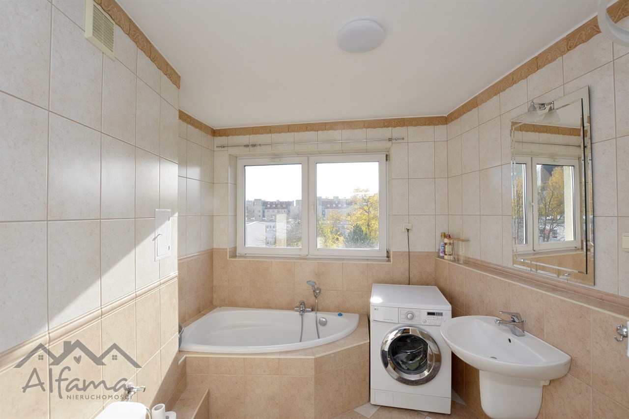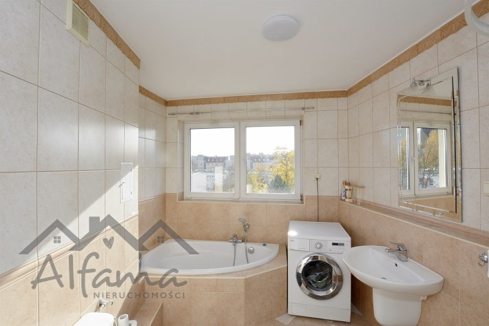 * duża łazienka z oknem , wanną i kabiną prysznicową.